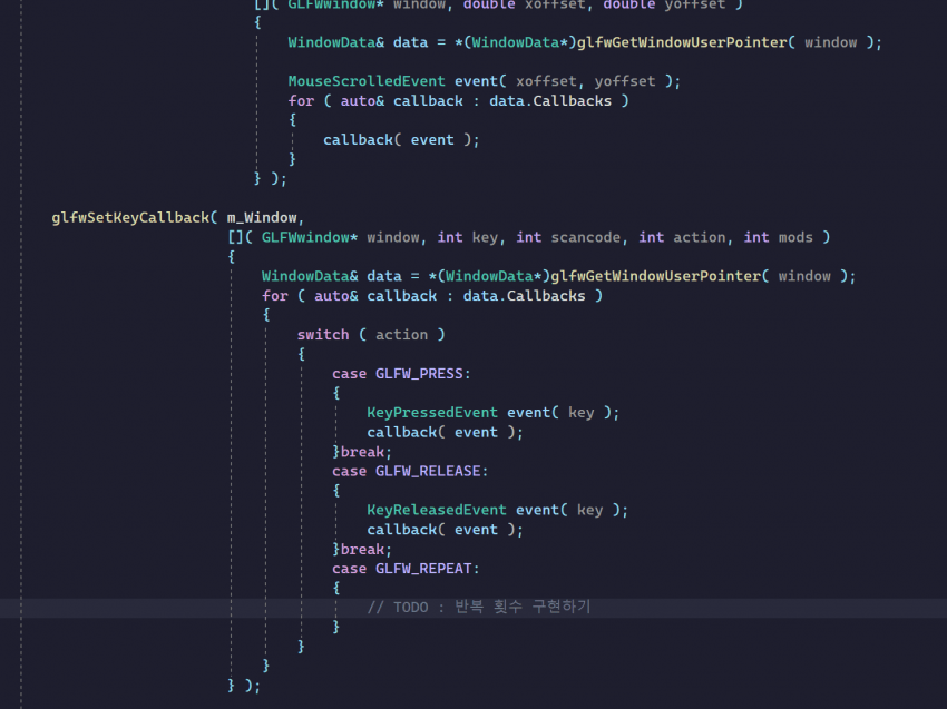 glfw로 윈도우에 들어오는 이벤트에 대해서 콜백 함수를 등록합니다.